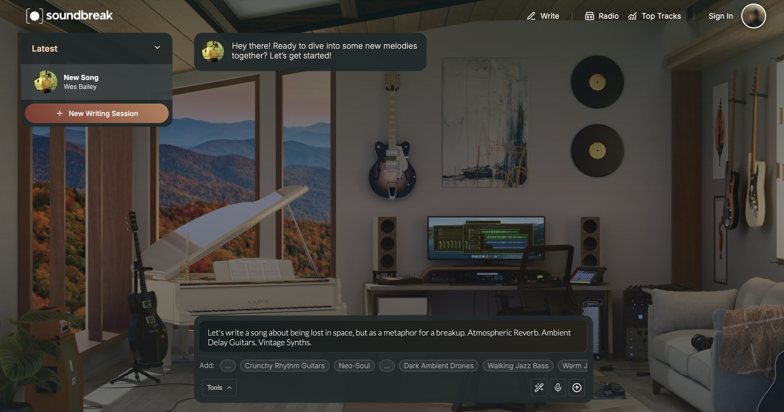 The whole Soundbreak experience is architected to feel less like querying a system and more like sitting across from one of these songwriters in an actual session.