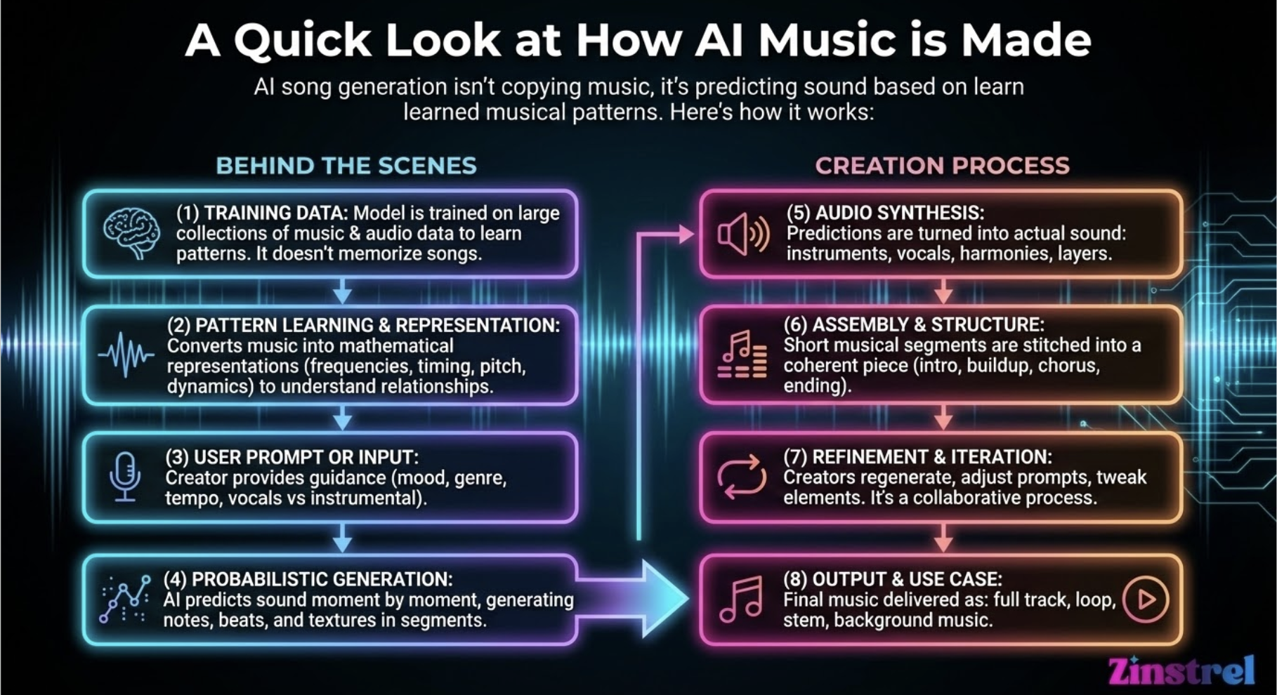 What they produce is newly generated audio based on learned patterns. That’s why outputs can feel familiar without being traceable. The model knows how music tends to work, not how a specific song works.