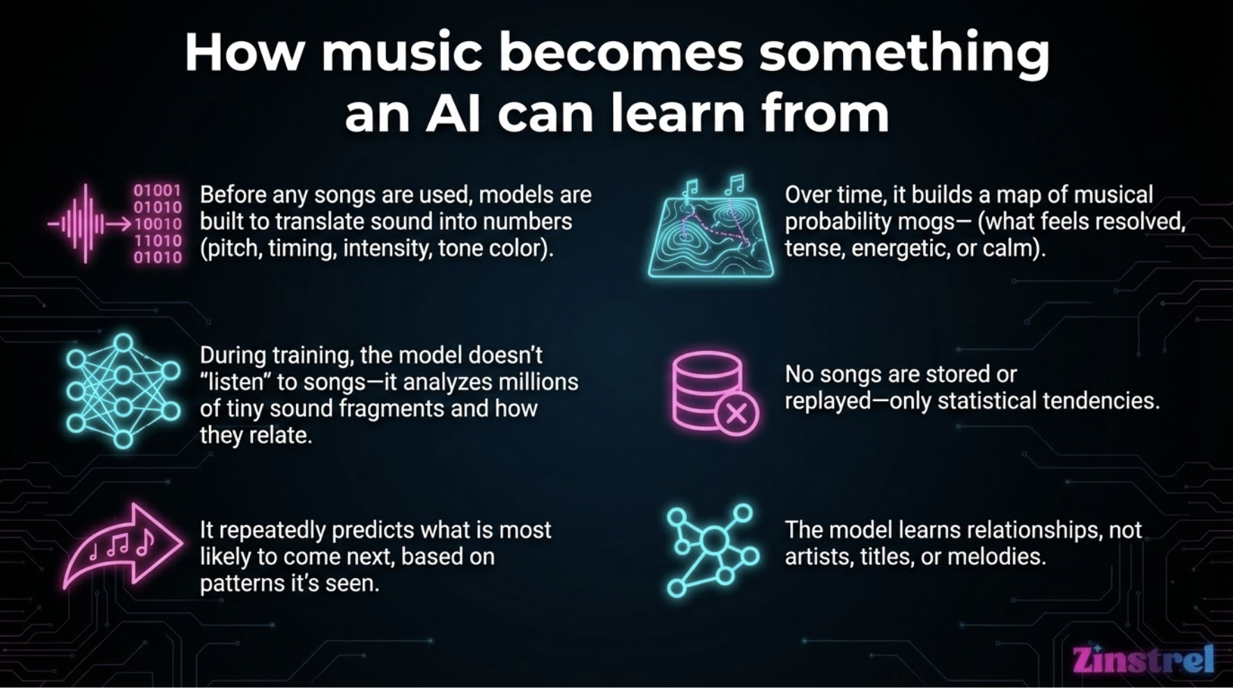 This is important: the model is not labeling songs, artists, or melodies. It’s learning relationships, not references.